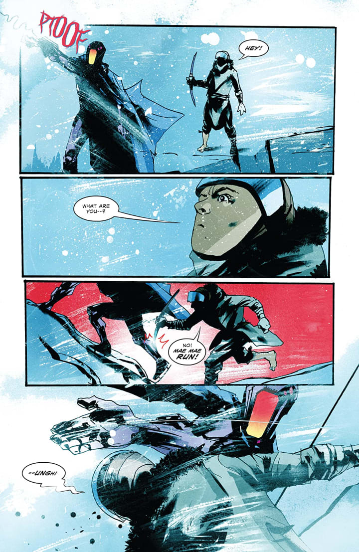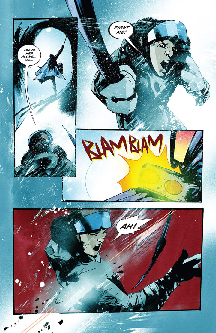 I continue to be in awe of the work that Jock does. The linework is great and how we see the varying weights and techniques being utilised to create the detail within the work we see is phenomenal. That we see such blue skies and snow swept winds crossing their paths along with rocks, crevasses and such really enhance and expand the moments. They also work within the composition of the panels to bring out the depth perception, sense of scale and the overall sense of size and scope of the story. The utilisation of the page layouts and how we see the angles and perspective in the panels show a masterful eye for storytelling. The various hues and tones within the colours being utilised to create the shading, highlights and shadow work really shows a great understanding of how colour works.