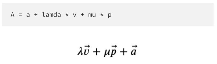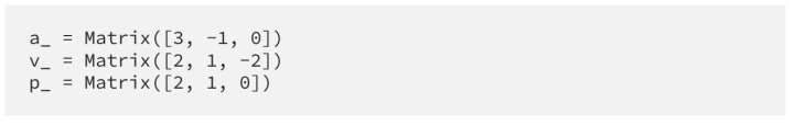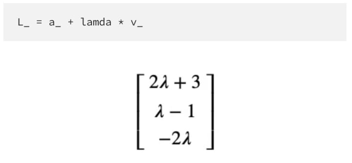Vectors are, in a certain sense, just matrices with a single column.I like to distinguish between the abstract entities 𝑎⃗ and 𝑣⃗ and the actual representations of those entities by appending a trailing underscore _. So for the line, we have the representation