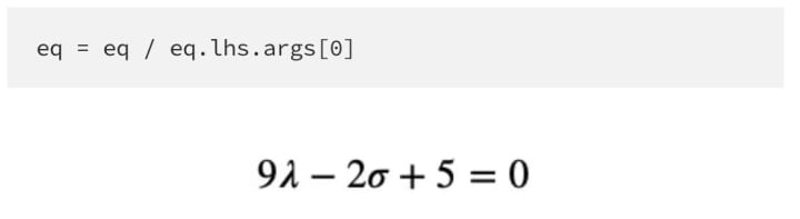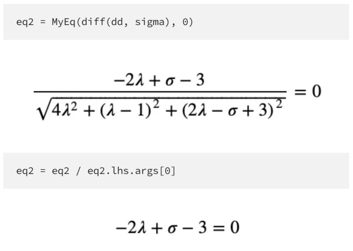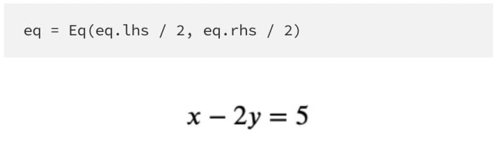 This is another annoyance: for manipulating equations in computer algebra systems like sympy, I have to treat left hand side and right hand side separately. I would like to write instead eq / 2 but that raises an exception. So this drives me to write a custom class inheriting from Eq: