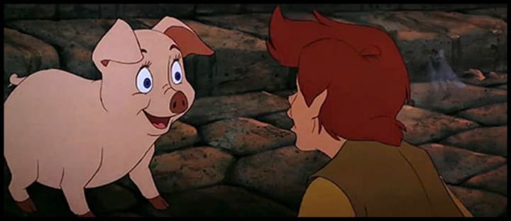 Hen Wen was an adorable pig I first saw in the Disney movie "The Black Cauldron". She played a crucial role in guiding the story's hero Taran on his journey. Hen Wen could predict the future through mysterious runes. Her significance and wisdom made her enchanting and memorable. She is a character from The Chronicles of Prydan book series by Lloyd Alexander.