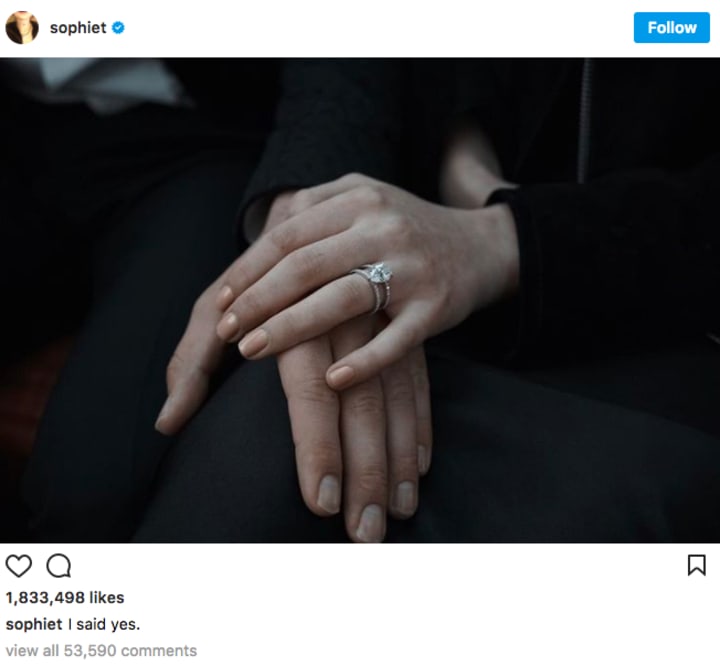Many took to their respective social media pages to express their jubilation with the news. Turner's #GoT co-star and best friend for life, Maisie Williams, commented her congrats on Turner's Instagram post with "Queen. I love you so much xo" while Jonas' brother, Nick, expressed his love on his Twitter with the accompanying engagement photo: