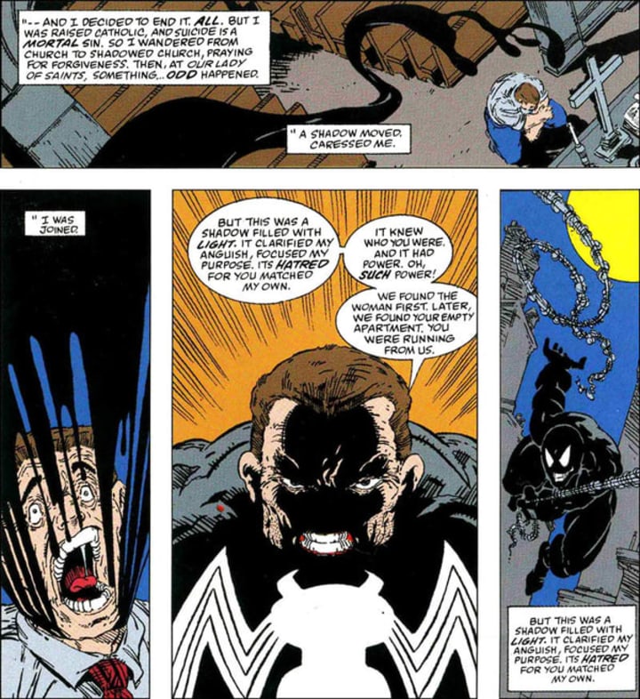 Rather than simply being someone else who gained spider-powers, Venom was actually a new host to the symbiotic black suit Spider-Man wore after the original Secret Wars storyline. Because the suit had been bonded to Peter Parker for a while, it retained his abilities at slightly enhanced levels. It also retained all of his memories. The retention of Peter's memories came in very handy for the next host of the symbiote, Eddie Brock. He was a journalist who was ridiculed by Spider-Man after he wrongly accused a man of serial murder, leading to a deep seated hatred of Spider-Man. When he came into contact with the symbiote that Peter rejected, it was the beginning of a twisted friendship.
