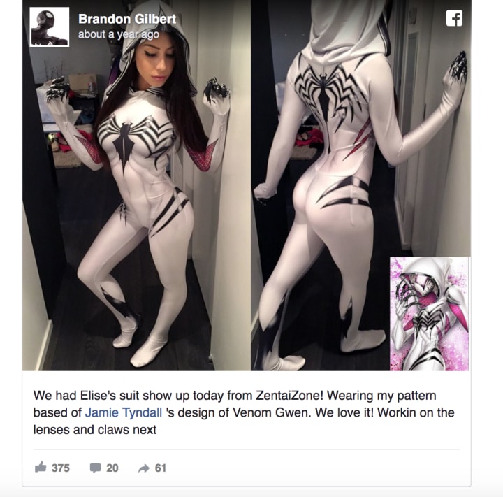 Brandon Gilbert turned the costume into a pattern, and it was made by Zentai Zone.