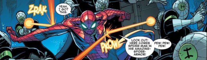 It hasn't always been sewing up holes in the costume and testing spider-tracers' stickiness on Aunt May's non-stick frying pan though; the modern Peter Parker is quite different. Thanks to Otto Octavius, Peter now runs his own worldwide company. As a result of this, Peter's suit has undergone some serious upgrades while maintaining the classic look. Many of these upgrades are carried over from Octavius's time as the Superior Spider-Man, including the enhanced goggles and web-shooters.