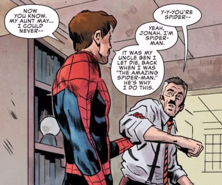 Spider-Man looks at Jameson, and realizes that things can't go on like this. He takes a radical step, and unmasks before the former reporter. He literally trusts J. Jonah Jameson with his secret identity, revealing the impact the death of Uncle Ben had on him all those years ago. He trusts one of his worst enemies, the man who created Spider-Slayers and the Scorpion, with the truth of who he really is.