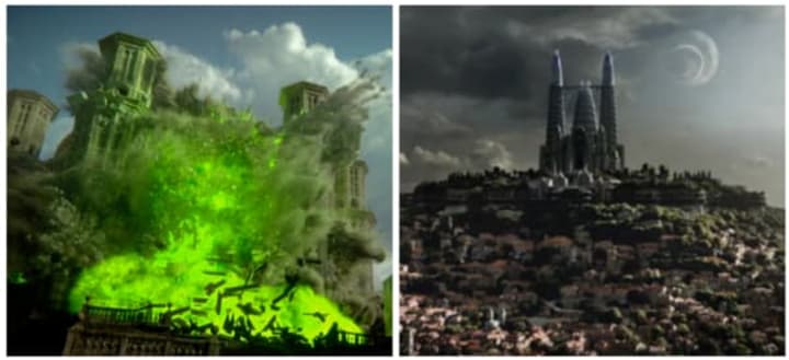 Presumably the large castle at the center of the titular Emerald City. Taking a darker route, and with the prospect of war, we should expect that D'Onofrio's wizard will come under attack. The trailer also shows a pretty big explosion, and we know that Thrones sure loved its green — blowing up the Great Sept of Baelor at the end of Season 6.