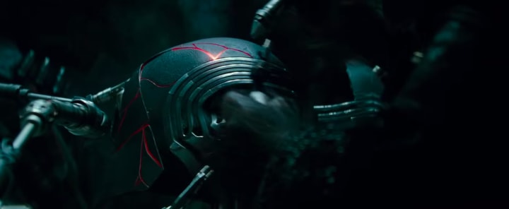 We see what I believe is Kylo Ren resurrecting his helmet after he brutally smashed it in The Last Jedi. Why is he doing this? Well, he smashed his helmet after his confrontation with Snoke, tired of being Snoke's puppet.