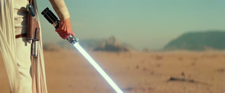 As a TIE Interceptor heads directly toward her, she ignites her lightsaber. You'll notice the lightsaber is blue, meaning that she has either repaired the Skywalker lightsaber, which was broken in two in The Last Jedi, or she made her own lightsaber, like what Luke did in Return of the Jedi.