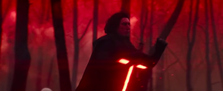 Here, we get our first good shot of Kylo Ren. He is unmasked and in a forest with a red sky. This must be yet another new planet that we are seeing in this film.