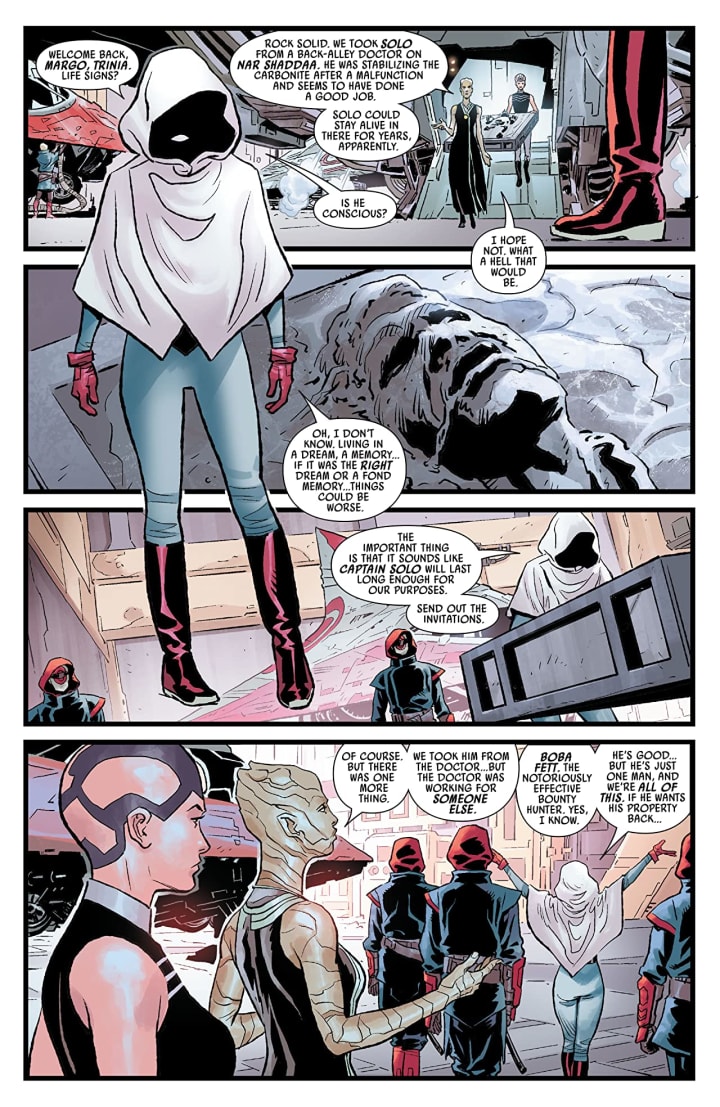 I love this for a myriad of reasons but what Charles is doing by creating that time between Boba Fett capturing Han Solo and delivering him to Jabba the Hut is one of my favourite stories set in the Star Wars universe and it’s barely begun. The reputation of Boba Fett is notorious throughout the known Galaxy so it’s a big deal that someone stole something from him, much less a bounty such Solo. This inherently generates its own kind of intrigue and electricity in the excitement factors. I mean we all know, even the most casual of fans, his reputation and he’s such a huge figure in popular culture that the anticipation of what’s to come is superb.
