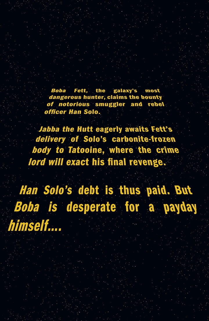 The notorious bounty hunter BOBA FETT has finally landed his greatest prize – HAN SOLO, frozen in carbonite for easy transport. Fett will bring the smuggler to TATOOINE to collect the massive bounty placed on Solo’s head by the fearsome crime lord JABBA THE HUTT. Sounds easy. What could go wrong?