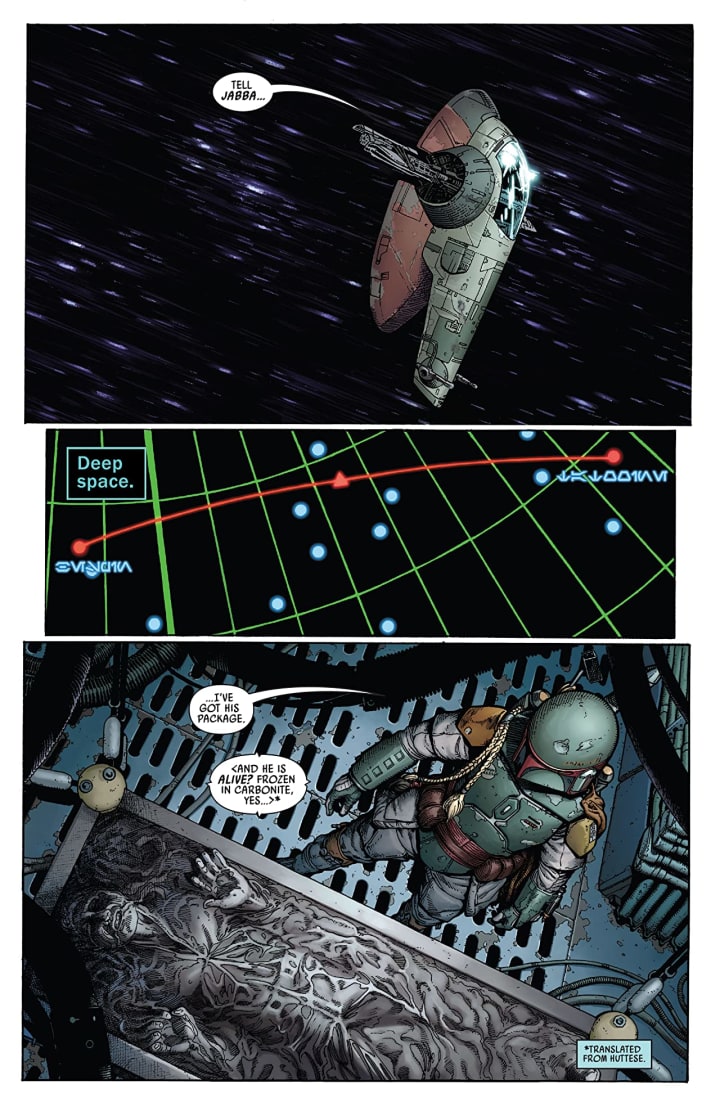 Now I am not sure we ever saw what happened when Boba caught Han and then transported him to Jabba before now. Granted I’m not the kind of die-hard fan that some are but I will say that this is one of those stories that we all know about, okay not all but anyone who has seen the films will know where this fits into the franchise chronologically. Now I will read pretty much every single story Charles will write because the man has some skill and talent when it comes to writing and that he is able to bring the reader into the story is phenomenal to see.