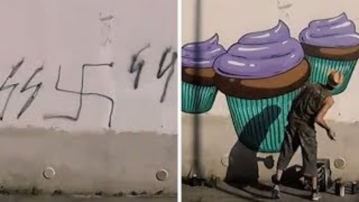 Food art is his passion, so he transforms hate remarks, symbols such as swastikas, and more into cupcakes, cheese wedges, salads, and cornucopias flowing with fruit and vegetables.