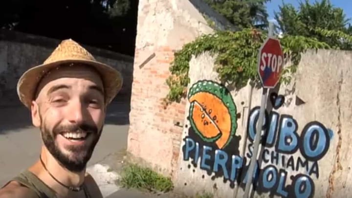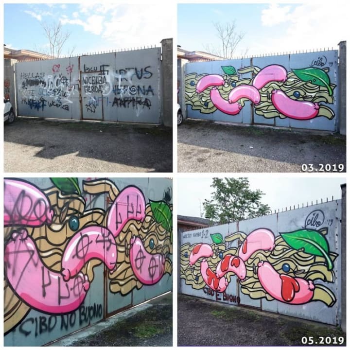 Cibo is a street artist based in Verona, Italy who uses food art to spread tasty values. He uses food because food is very important to Italians. It brings people together.
