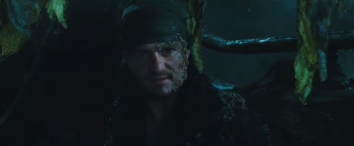 In the image, Turner can be seen from the chest up, sporting some odd material on the side of his face, as well as on bits and pieces of his clothing. The material on Turner's clothes look like barnacles, similar to the growing appendages on Davey Jones' crew before Turner became the new captain of the Flying Dutchman.