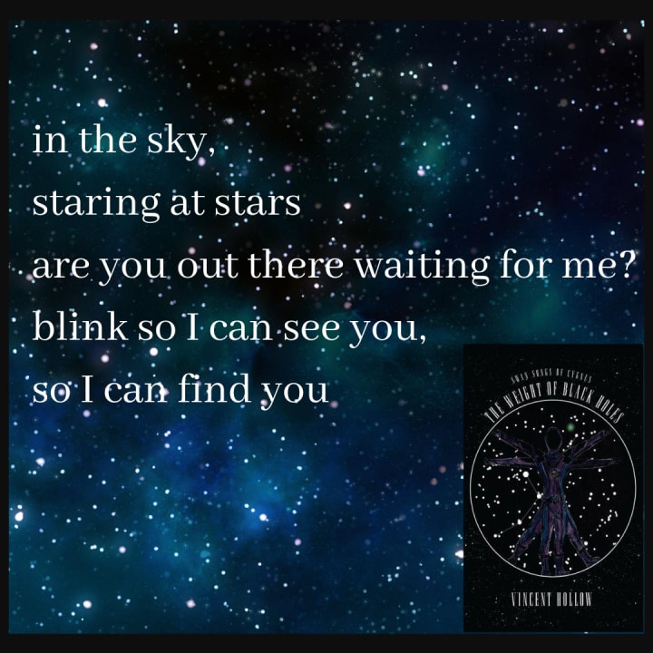 Vincent Hollow is an astro-poet and interstellar storyteller living aboard the space vessel, Aquarius. Shooting from the star system to star system. Vincent spends his time gazing out into the universal abyss and the depths of himself where he hopes to find his place in the cosmos through the words he weaves in the fabric of spacetime.