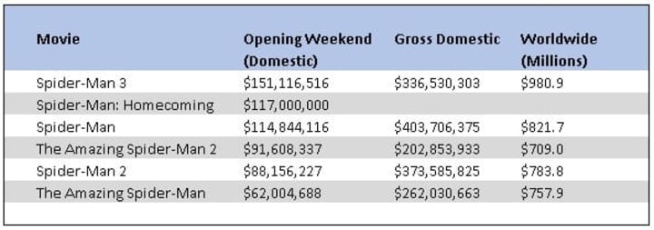 What makes this even more remarkable is that Homecoming's opening weekend is one of the strongest that the Spider-Man franchise has seen to date, beating everything but Spider-Man 3 (which, despite fan criticisms, performed surprisingly well as the end of a beloved trilogy). If Homecoming continues to perform on track, we expect that the film may ultimately gross somewhere between $800 and $900 million in the worldwide box office.