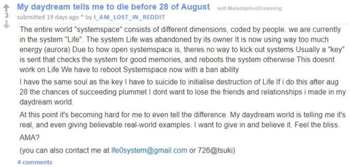 This all began early 2017, when a user who came to call himself Tsuki posted on subreddit MaladaptiveDaydreaming that he had to die before the 28th of August, because his doing so would activate the end of Life. Not life as in that which moves our bodies and operates our brains, but Life, the simulation, or System, in which our universe resides.