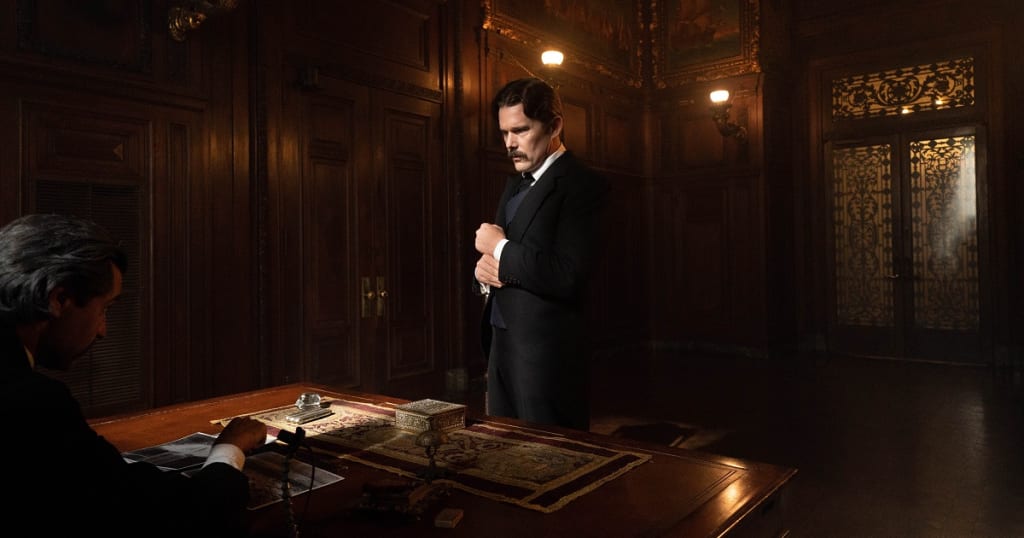 Tesla shares a similar outline with some of the most paint-by-numbers biopics: we watch as Nikola Tesla (Ethan Hawke) rises to prominence as he works on his idea of funneling electricity through alternating currents, meeting other industry titans (Thomas Edison, J.P. Morgan, George Westinghouse, to name a few) along the way. In other words, we follow the journey of a supposedly great man as he comes in contact with other supposedly great men. That is until Anne Morgan (Eve Hewson) comes onscreen and discusses the results you get searching for Tesla on Google. Quickly, Tesla makes it clear this story is something postmodern, and the accepted rules of recounting a historical figure’s life will not come into play.