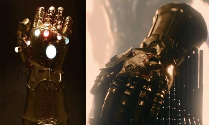 The gauntlet pictured on the left with "replicas of the Infinity Stones" was discovered early in the MCU, being spotted in Odin's vault from Thor, while the gauntlet pictured on the right was wielded by Thanos at the end of Avengers: Age of Ultron. After that tantalizing post-credit scene many presumed that Thanos had stolen the gauntlet from Odin's vault, but Marvel Studios Head Kevin Feige clarified to CinemaBlend last year that the gauntlet Thanos has is not the same one (in fact, you can see they belong on different hands).