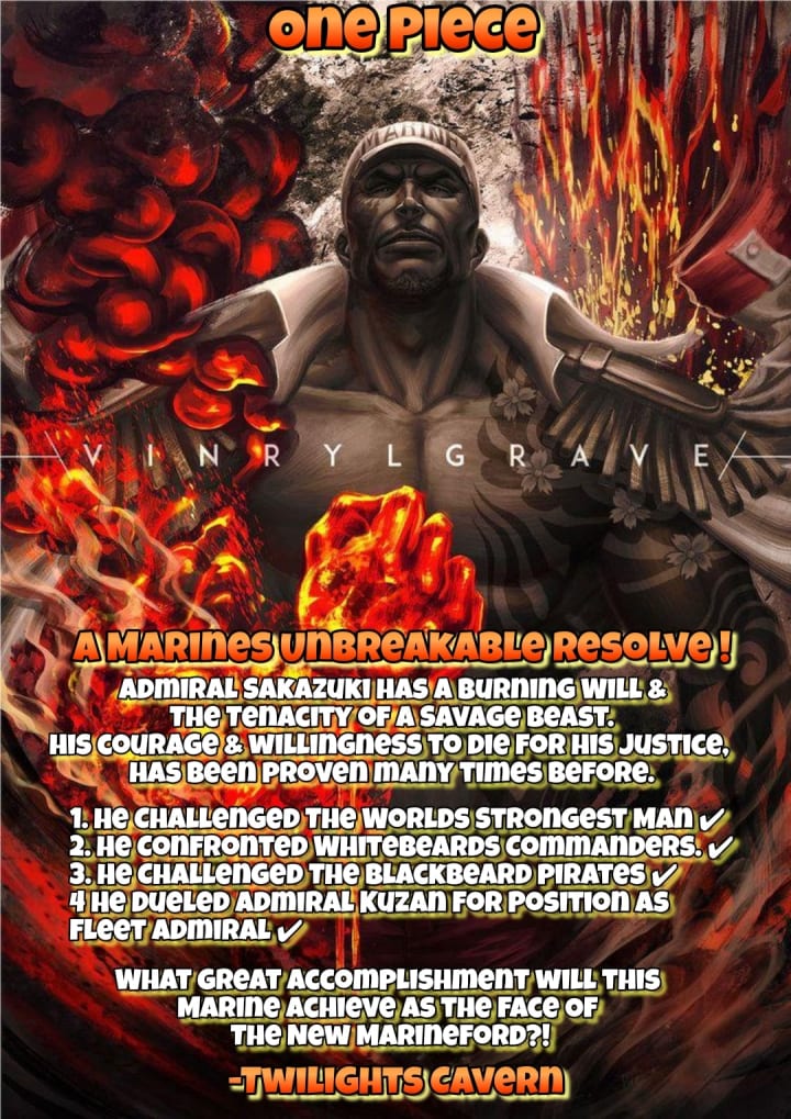 Sakazuki has at his command, the Greatest Military might in Recent Marine History. A Man of his devotion, had Clashed with Whitebeard. A short while after the Paramount War, This Admiral would attempt to Confront & Battle The Pirate Captain Blackbeard & His Entire Crew on his Own with a Single Battleship & A few Number Of Troops at his Command. The Point must be pushed that Sakazuki's presence alone had forced Blackbeard, & his Crew Of The Strongest Level Six Escapees to resort to a Full Retreat to avoid Clashing with the Admiral.