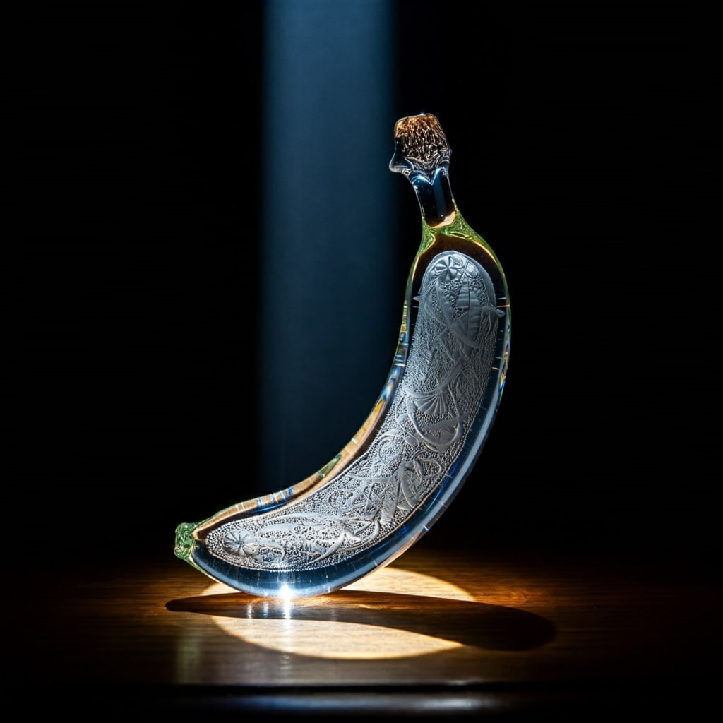Legend has it that this banana was born from a celestial orchard, nurtured by starlight and bathed in moonbeams. It is said to have fallen to earth during a meteor shower, landing in a hidden grove deep within an enchanted forest. For centuries, it was guarded by wise sprites who recognized its extraordinary potential. The banana's vibrant glassy hue and curved shape conceal a multitude of magical properties, each tied to the real-world benefits of its earthly counterpart.
