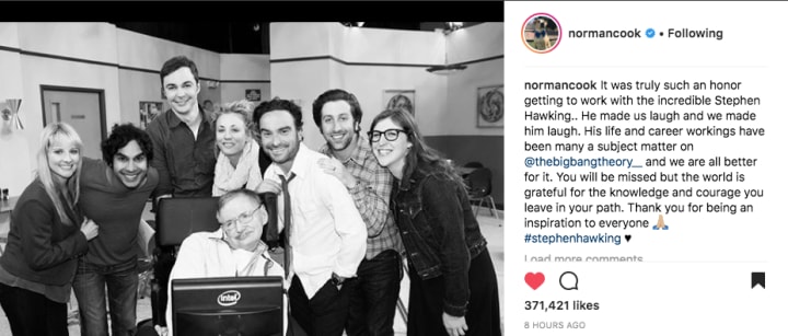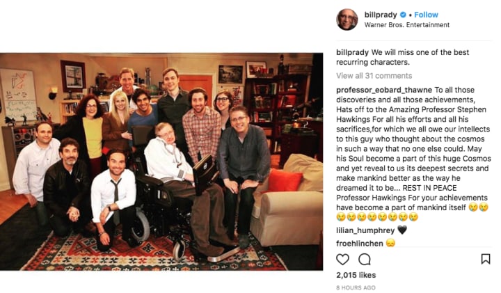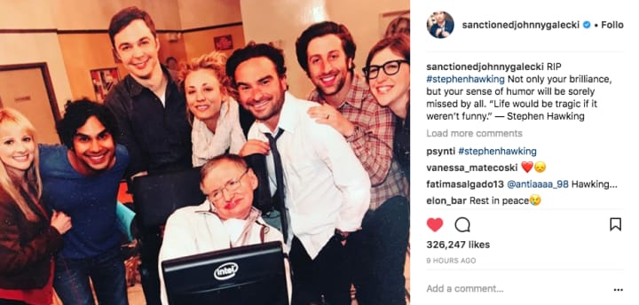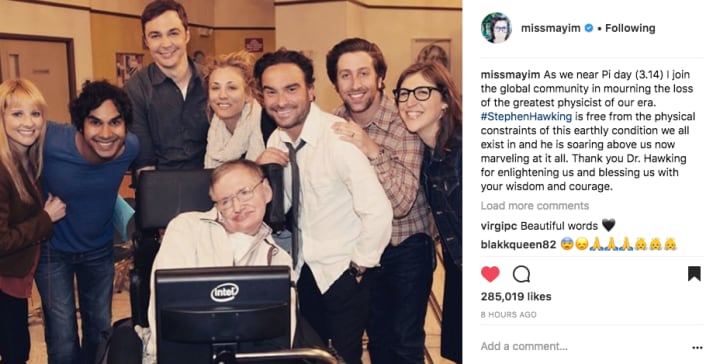 "It was truly such an honor getting to work with the incredible Stephen Hawking.. He made us laugh and we made him laugh. His life and career workings have been many a subject matter on @thebigbangtheory__ and we are all better for it. You will be missed but the world is grateful for the knowledge and courage you leave in your path. Thank you for being an inspiration to everyone 🙏🏼 #stephenhawking ♥️"