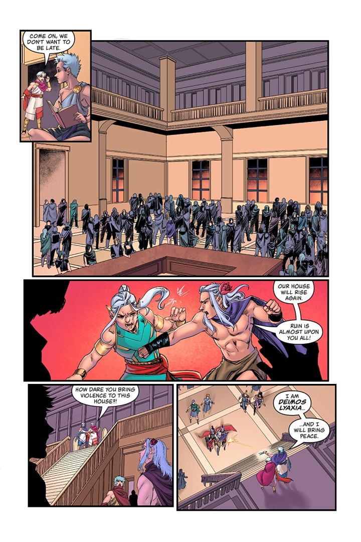 The interiors here are absolutely stunning. I mean instead of old school architecture we see this ultra sleek and modern city that has this amazing glow about it. All that glitters may not be gold if you scratch the surface. The linework is beautifully rendered and how its varying weights and techniques are being utilised to showcase the detail work is exceptional. I want to see more backgrounds, this is another “planet” and it’s a great opportunity to show off that creativity and imagination. The utilisation of the page layouts and how we see the angles and perspective in the panels show a superb eye for storytelling. The colour work is divine. How we see the various hues and tones within the colours being utilised to create the shading, highlights and shadow work is stunning work.