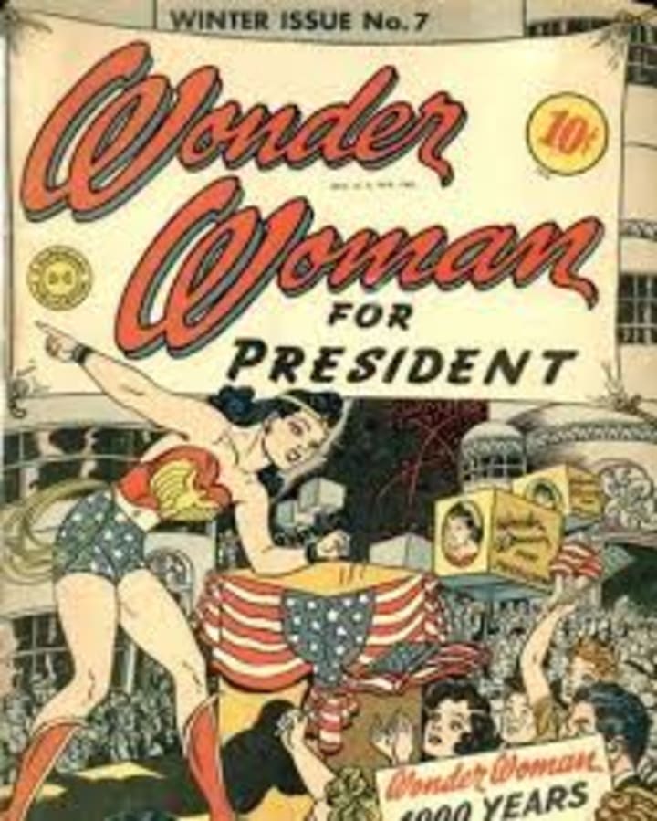 This particular Wonder Woman comic was published during the war. On the cover she is standing on a podium alone delivering a message. While it is a fantasy sequence since Wonder Woman was not born in the United States, it delivers a portrayal of a woman in a leadership role who clearly does not need a man to support her. (Although there are even men in the crowd who seem to be cheering for her) While the government and media were not encouraging women to become president during World War II, it falls in line with the image that women were expected to be strong during this time period.