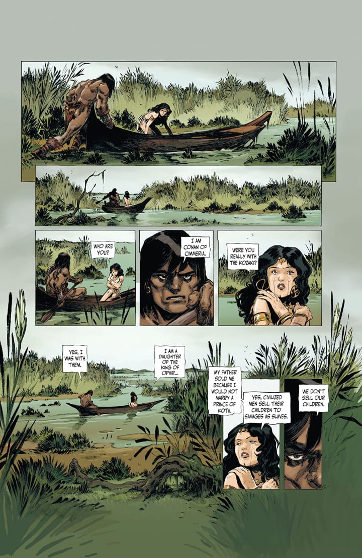 I loving the way that this is being told. The story & plot development that we see through how the sequence of events unfold as well as how the reader learns information is presented exceptionally well. I mean that we don’t see her run away to open up the issue, we see that in a flashback, and instead start off where Olivia is found first by Shah Amurath and then saved by Conan is just the way it should be. The character development that we see is fabulous and as we see them act and react to the situations and circumstances they encounter alongside the dialogue really manages to flesh them out as people. The pacing is fantastic and as it takes us through the pages and sets up the story at hand it pulls us into this crazy world they inhabit.