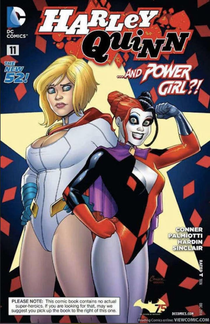 Some other major storylines show her involvement with various teams: Secret Society of Super Villains, Secret Six, Suicide Squad, Gotham City Sirens, and a partnership with Power Girl. Hilariously, at one time, there was a Batman/Teenage Mutant Ninja Turtles crossover and Harley was turned into a mutant hyena by the Shredder — not sure how much canon is involved there, but it definitely happened.