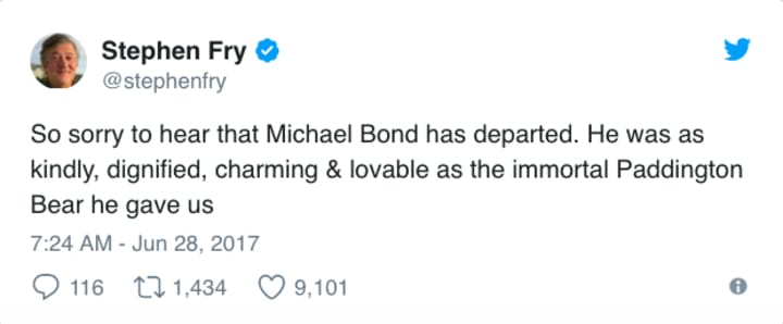 The Chief Executive Officer of HarperCollins said Michael Bond was, "one of the great children's writers," who has left "one of the great literary legacies of our time."