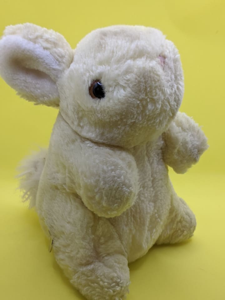 I don't remember receiving my first stuffed animal, but supposedly this little yellow bunny was one of the first, if not the first. It has a wind-up tab and plays the tune of "Peter Cottontail" - yes, it still works, even about 30 years later! I cannot confirm if this was made prior to my birth, as the tag is now unreadable. If this was given to me right away, it's possible that it was with me my first month of life where I was in an incubator (I was born premature). Overall, it's pretty clean and in good condition!