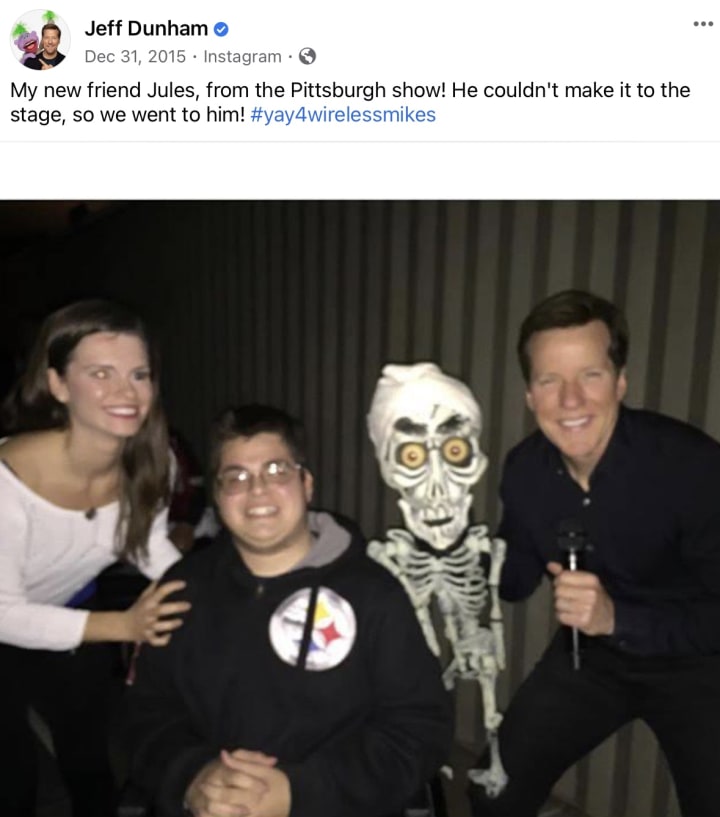 Jeff Dunham ended his show with his puppet Achmed. Achmed was reading questions from fans. I was waiting for Achmed to read my question. Achmed got to my card and read it out loud to the audience. “Dear Jeff Dunham, can I please take a picture with you?” Sincerely, Jules! Achmed said “No!” The entire audience laughed, even I laughed. Jeff Dunham said “Jules, come on down.” I was speechless I couldn’t believe that Jeff Dunham the world’s greatest ventriloquist wanted to take a picture with me. I didn’t know how to get to the stage. Jeff Dunham said “Jules, are you coming down?” The cat still had my tongue. Suddenly an old man said “He’s in a wheelchair!” Jeff Dunham said “He’s in a wheelchair? I’ll come to him.” Jeff Dunham walked off the stage and started walking up to the balcony section. I thought I was dreaming. The entire audience was cheering. When Jeff Dunham got to the balcony, he said “Jules, how are you?” I said “Good, how are you Jeff?” Jeff Dunham, Achmed, and I took a picture together. After the picture was taken Achmed said “Shit, I think I blinked.” Jeff Dunham posted the picture on all his social media websites with the caption, “My new friend, Jules from the Pittsburgh show! He couldn’t make it to the stage, so we went to him. #YayforWirelessMikes” Jeff Dunham even gave me his Little Jeff puppet that he used on stage. It was the best New Year’s Eve I ever had!
