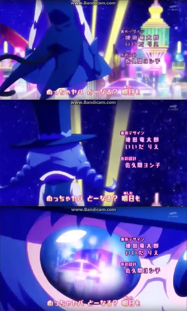 During the opening sequence a girl with a cat tail, cat ears, a top hat and all in dark blue appears. She is stood in front of what appears to be some advanced alien city, which some fans speculate may be where the intergalactic invaders of Notraiders are operating from. If this is the case, it suggest Cure Cosmo's identity may yet to have been revealed, as she could be a survivor and seeking to free her home and people. This was further supported through a recent magazine in Japan.