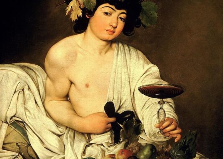 Looking at the colour schemes of these paintings and the colour schemes of the "Bacchus" scenes in the film (in which Caravaggio is young and looks like the paintings of "Bacchus" [above]), they are not only similar, but various images in the film are the same as the paintings. For example: the man eating upon fruit, the symbols of fruit is so much at large in the Bacchus scenes that you cannot possibly miss it. It is not only giving the impression that this was the ear in which the paintings were done (1590s) but it is also giving the idea that the fact that fruit was so prominent, it may have been where the idea of the fruit came from - especially the grapes. Grapes being the food of wine and Bacchus being the God of Wine. But, in my opinion to say that Bacchus as a figure in the painting was based on Caravaggio himself is a tiny bit of a stretch and is not well received by Caravaggio scholars today.