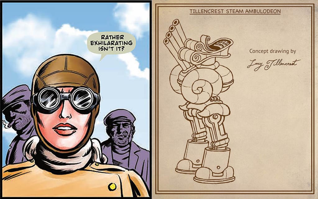 Amidst what I perceive as “the grittiness” of Steam Wars’ iron and steel warrior machines and its (hopefully somewhat) realistic depiction of life and toil on board said steam rigs, Lucy Tillencrest stands as a shining beacon of eccentric behavior in the cause of imaginative genius. Not to diminish the nature of what I consider a vital character and role model, she is by her very being a strong contrast in a world dominated by mechanized steam warfare.