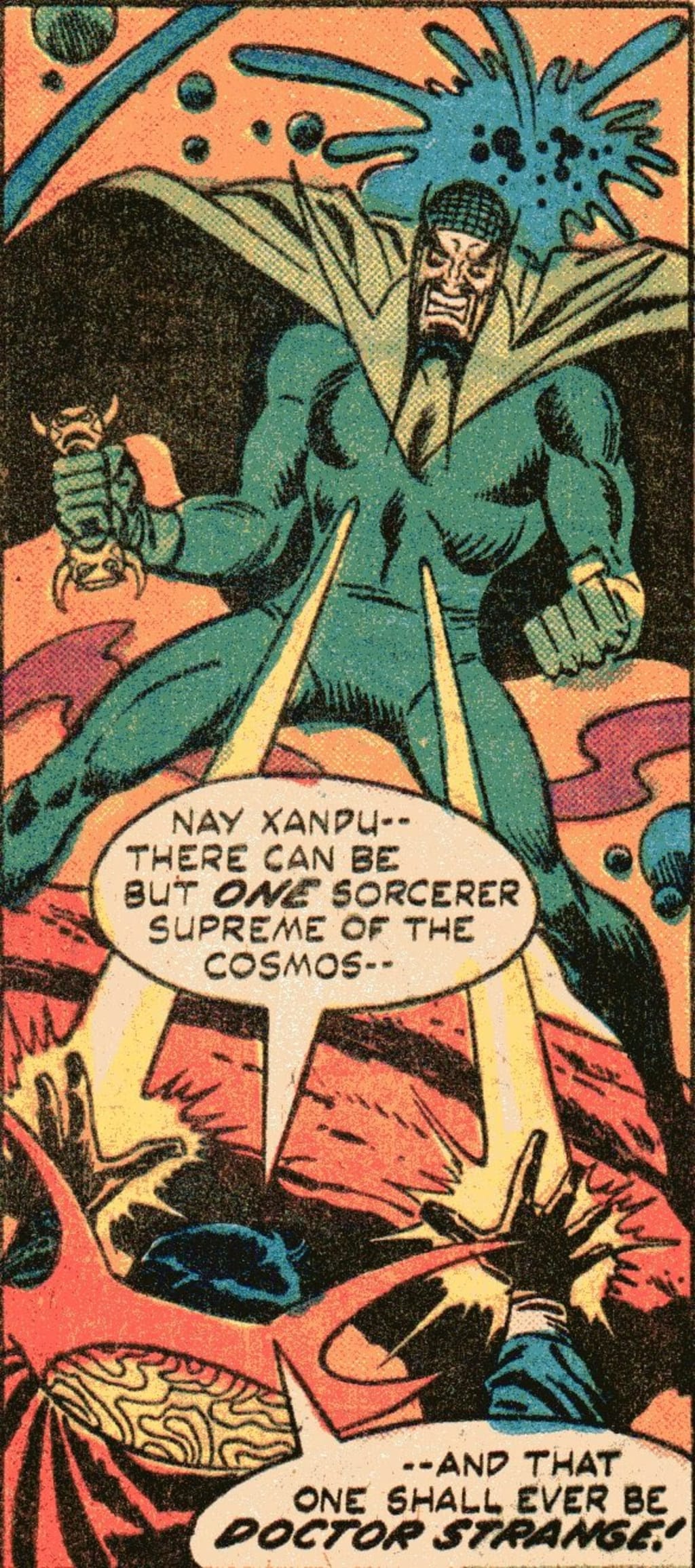 One of the best easter eggs in the Dr. Strange movie is a Spider-Man reference (essentially, indirectly, if you fudge it a little), and one of the first superheroes to be mentioned by name in a Spider-Man movie is Dr. Strange, but Dr. Strange and Spider-Man have been crossing over since early in their mutual existence despite significant superficial dissimilarities. This is because they were both created by Steve Ditko, and putting them together is a nod to Ditko’s two greatest creations. In Spider-Man 2, Ted Raimi’s character briefly considers “Dr. Strange” as a name for Dr. Octopus, just a trivial throw away joke, but the more significant Spider-Man easter egg in the Dr. Strange movie comes in the form of the Wand of Watoomb, Wong’s weapon of choice in the final battle, which first appeared in Spider-Man Annual #2 in 1964. The oldest floppy issue of Dr. Strange I own is a reprint of this story under the Dr. Strange title that came out in 1969. It’s also the Dr. Strange floppy I spent the most for: a whopping $5. One of the greatest things about Dr. Strange is that most of his comics are very cheap. You can get some real masterpieces for a buck, and this classic was a steal for five bucks. This first meeting between the two great sons of Ditko sets the pattern for many meetings to come, most of which involve the Wand of Watoomb and Xandu as the villain.
