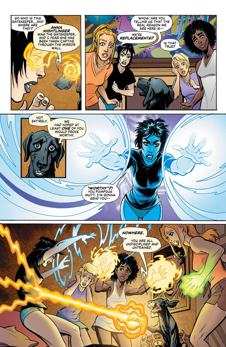 The girls go into training under the tutelage of the wizard/dog, Pitch, to master their mystical skills. And not a moment too soon as the mysterious Levi Skeggs and his minions, come gun-ning for the girls to take “the chosen one” to the dimensional demon, Abraxis!