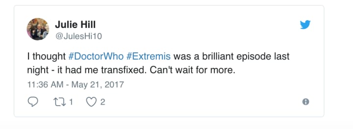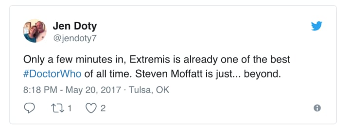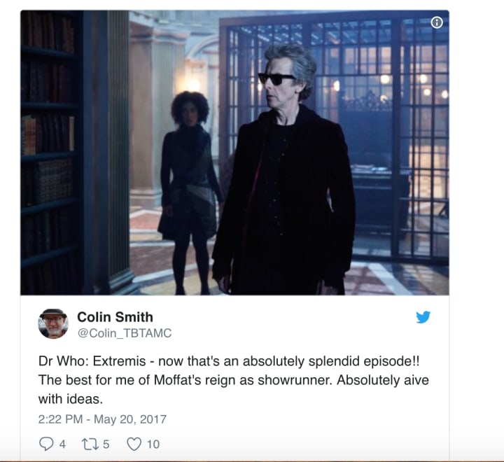 Kicking it all off, one tweeter, Colin Smith, hailed "Extremis" as the best of Moffat during his time as showrunner: