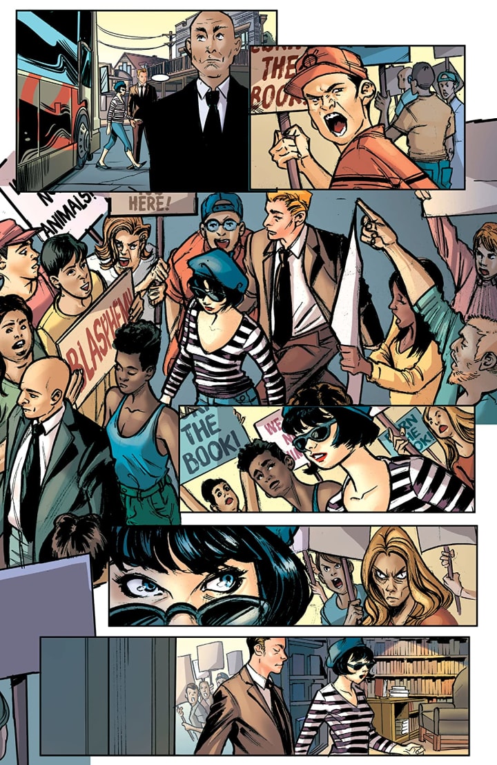 The interiors here are really rather nice. The linework is clean, crisp and strong, the varying weights and techniques we see being utilised to create the detail work that we see throughout the book is beautifully rendered. I love the more traditional comic book style of the work and how it kind of mixes the old Romance comics with those older comics and creates this fresh, new and exciting look. Backgrounds are utilised really well throughout the book as they expand and enhance the moments beautifully. They also work within the composition of the panels to bring out the depth perception, sense of scale and the overall sense of size and scope to the story. The creativity and imagination that we see is incredibly well rendered and the changes that overcome folks really enhances the creepy factor. Though I will say I was slightly mystified why that dude in the bookstore’s shirt looked different during the act compared to after I mean we should’ve seen his equipment. The utilisation of the page layouts and how we see the angles and perspective in the panels show a remarkably talented eye for storytelling. The various hues and tones within the colours being utilised to create the shading, highlights and shadow work show a great understanding of how colour works.