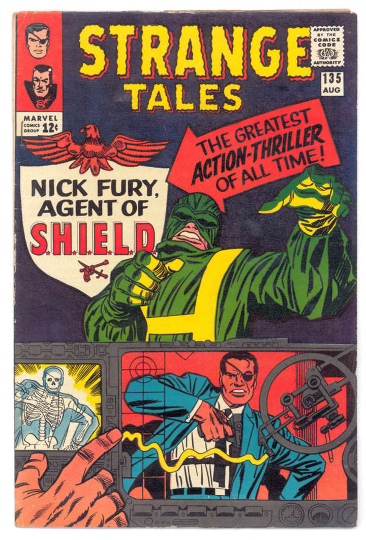Long-time Marvel fans will smile at the tagline "Strange Tales". Strange Tales was the title of a long-running Marvel title, launched in June 1951. Several classic Marvel characters debuted in Strange Tales — including, most famously, Doctor Strange himself. But the most amusing twist here is that Strange Tales #135 saw Marvel bring the character of Nick Fury into the present day, and even introduced the concept of LMDs.