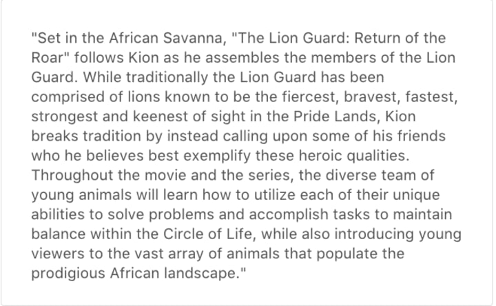 The Production will follow Kion who is Simba and Nala's 2nd son who will be the leader of a group of animals. Kion will be preserving the Pride Land. After the film in November, "The Lion Guard" TV series will be broadcasting in early 2016 on Disney Channels and Disney Junior channels.