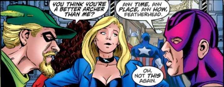 On the Marvel side, Hawkeye started out as a minor Iron Man villain, teamed up with the Black Widow, who was also a villain and saboteur, before the two eventually switched sides. Already, while Hawkeye looked different from Green Arrow, their key similarity was being archers who used fantastic trick arrows such as rope arrows, glue arrows, explosive arrows, and more to help them fight more powerful foes.