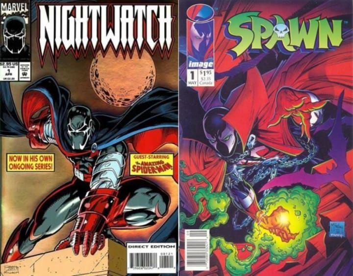 Spawn was immediately popular, resulting in a hit line of toys, an animated series, a movie, and many spin-off characters and series. Naturally, other publishers wanted to cash in on the action so Marvel quickly developed the character Nightwatch, who appeared mostly in Spider-Man comics. The character looked very much like Spawn, had a name similar to other gritty characters of the time (a running joke in the 90s was that characters had to have names involving "night, death, dark, claw, or blood"), and even included a weaponized cape among his abilities, as Spawn did. The character did not appear for very long, though it has had some circulation since the 90s, notably in She-Hulk.