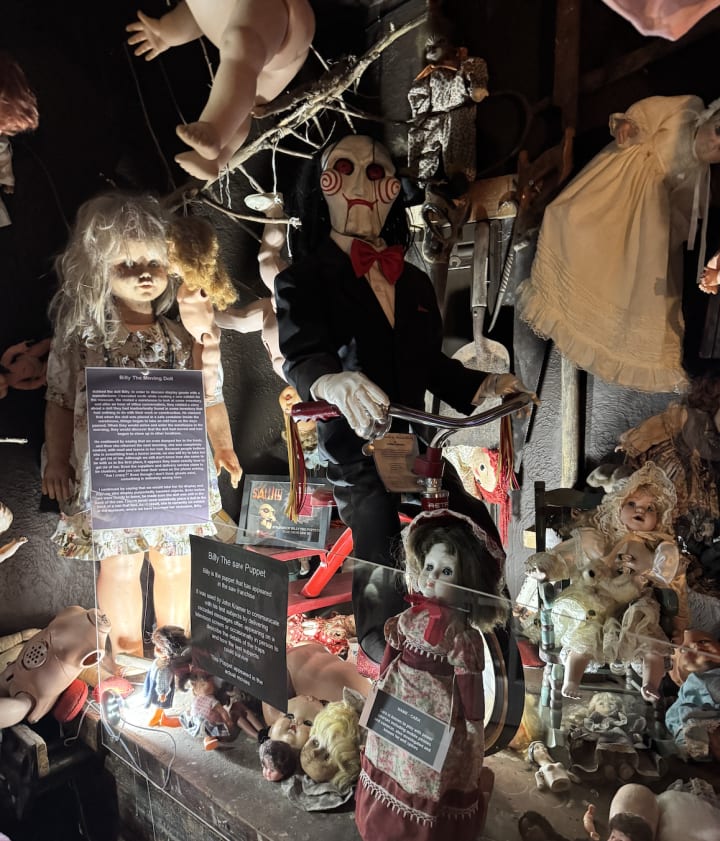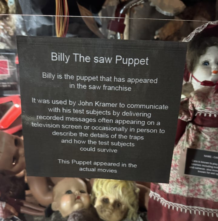 Another thing I saw was entitled the 'exorcism' room in which there was, as I ascended the stairs, a large statue of the doll from Child's Play in a certain animatronic style which you would imagine those in the Perpetuity Wing of the woman who states there's an animatronic Kier in the second season of Severance. (Yes, I am a huge Severance nerd). I was mostly surprised by the fact that there was so much stuff here. I mean someone had gone to some lengths to put everything in one room concerning the classic horror films from the resurgence in the 1960s and 70s. I thought that this room was perhaps the best decorated and kind of looked a bit quirky. If you guys remember me mentioning that back in Birmingham I used to have a huge ancient Egyptian coffin as a decoration in my bedroom, you can understand why I'd enjoy something like this.