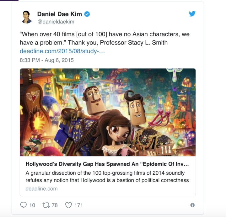 Back in 2015, Kim pointed out the lack of Asian characters in Hollywood by sharing a Deadline article on his Twitter page:
