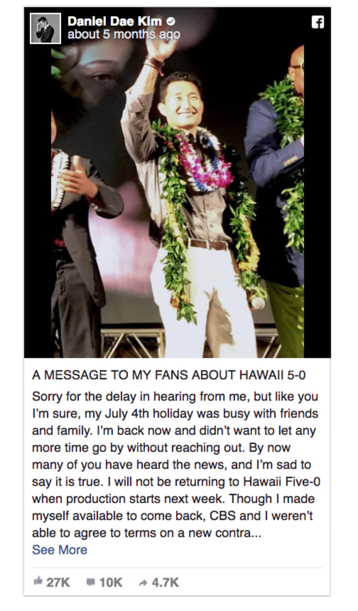Sorry for the delay in hearing from me, but like you I’m sure, my July 4th holiday was busy with friends and family. I’m back now and didn’t want to let any more time go by without reaching out. By now many of you have heard the news, and I’m sad to say it is true. I will not be returning to Hawaii Five-0 when production starts next week. Though I made myself available to come back, CBS and I weren’t able to agree to terms on a new contract, so I made the difficult choice not to continue.