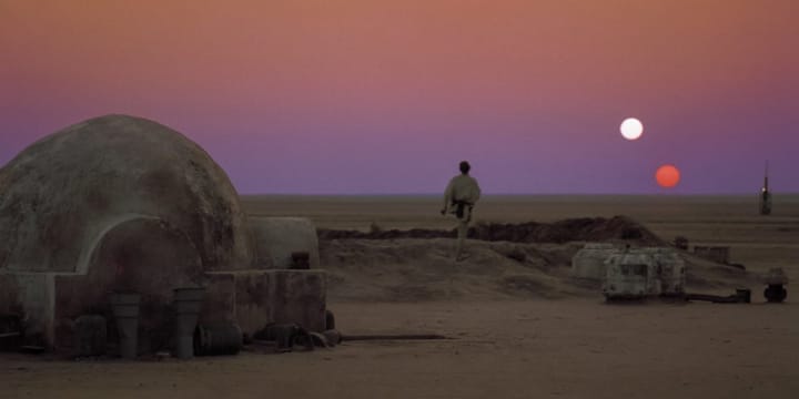 The binary sunset of Tatooine, the melted rose and lilac, contrasted with the searing tone of the suns that casts golden light upon faces pursed with wanderlust.