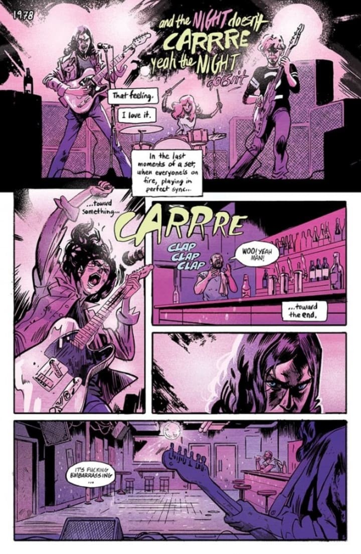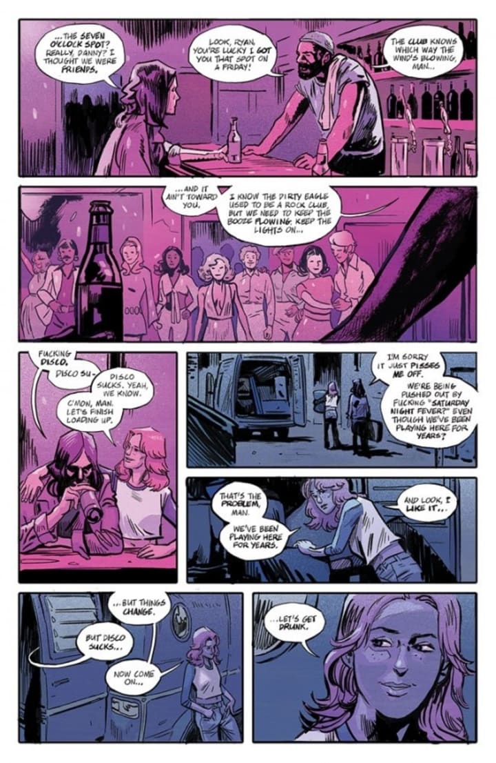 I am totally digging the interiors here as well. It has this 80’s underground comix kind of feel where grunge meets rock and it does wonders to draw readers into the story as well. The linework is amazing and how we see the varying weights and techniques being utilised to create the detail in the work is stupendous! I could do with more backgrounds but how we see the composition within the panels bringing us this depth perception, sense of scale and the overall sense of size and scope to the story all is forgiven. The utilisation of the page layouts and how we see the angles and perspective in the panels show this really sublime eye for storytelling. The colour work too is intriguing to me. There are a lot of pages where the colours remain pretty much the same throughout the panels but how the various hues and tones within the colours are utilised to create the shading, highlights and shadow work is brilliantly rendered. I am thoroughly impressed with what I see within these pages.
